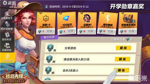 9月5日至12日,玩家每天都将接到活动任务,任务内容包括战斗排名、击杀对手数等。完成任务即可获得活动勋章,活动勋章可用于兑换各种诱人奖励!例如,5个活动勋章可兑换5颗战星或100钻石,10个活动勋章则可兑换喷漆、动作、嘉奖福利箱,幸运的玩家还有机会获得永久死亡小恐龙皮肤“恶魔之子”!