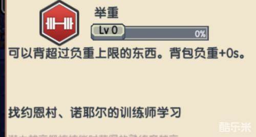 1。举重 学了举重你就可以超重得拿更多的物品了 这里要注意(你只能拿100个物品,但有些东西能叠加还只是算一个物品)还有要注意是只有超过了你身上的重量,举重才会加经验。