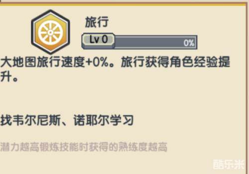 2。旅行,学了这个技能,能加快你的升级脚步,主要加速你跑图的速度,小知识!(城镇里和在城镇外面流逝的速度是不一样的城镇慢,但到外面时流逝速度会非常快)。学这个方便跑图 ,做委托