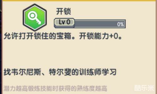 5。开锁,这是一个非常纠结的技能,不学开不了箱子。学了等级又太低,还是开不了箱子。哎,苦!!!。但是这个技能必须学,不然以后你看到箱子就只能看!注意(这个技能没必要去训练他)