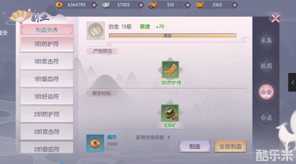 1,冶金:一般二阶的附就能来卖钱了,其中最贵的是防护符,跟攻击符一个大约能卖到400---1500银,并且都只需要赤铜矿跟秘银矿,也就是采集达到4级就可以做,效率很高。当然等级越高的越贵,最贵卖到几千银的都有。