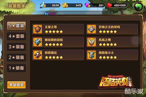 打开图鉴菜单,亲爱的召唤师你会发现,左下角多出了一个装备图鉴的按钮,点开它,各种装备一目了然,就连每件装备的属性都是可以全面了解的哟。装备图鉴整体来说与英雄图鉴一样,从五星到一星进行排列,但是由于四星以及五星的装备是拥有套装属性的,因此三星及三星以下的装备都是以散件形式展示,而四星及五星的则是以套装的形式展现给各位召唤师们。当然点开每一件装备都能看到它们的属性哟,而套装还是有特效显示的。