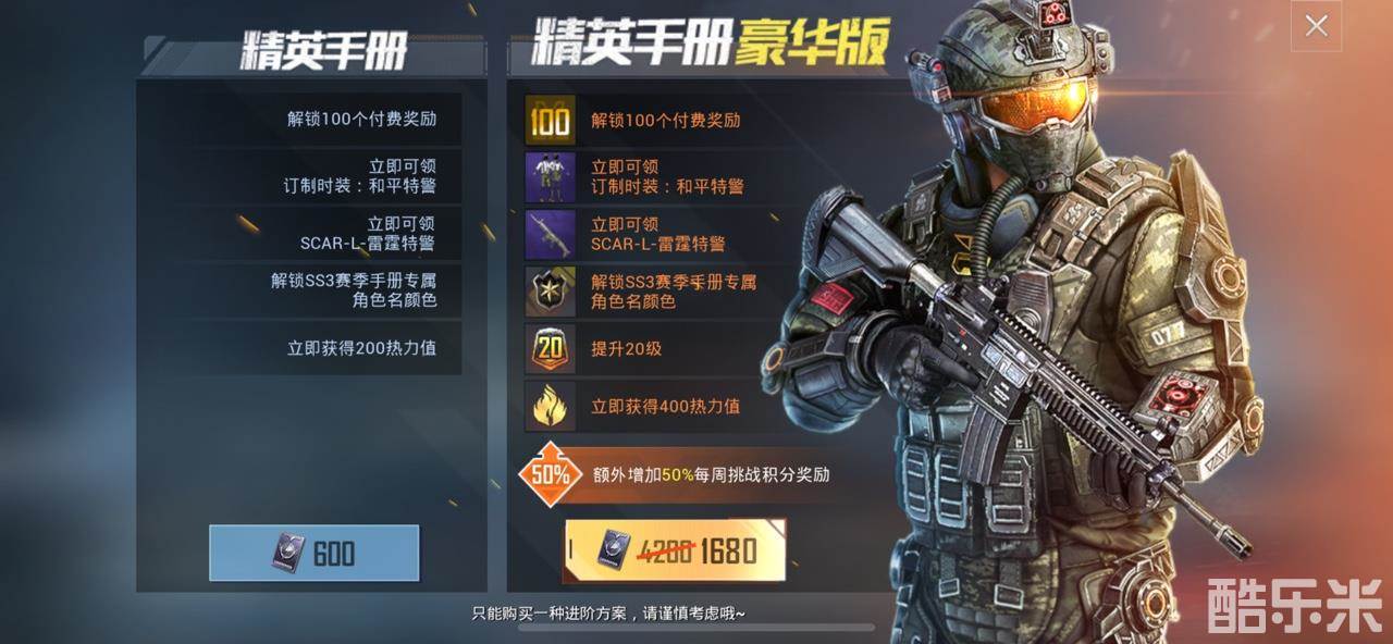豪华版和普通版的主要差别就是升级比较快,可以更快的获取赛季手册的等级奖励。本赛季手册的最终100级奖励非常酷炫,是特警样式的皮肤,穿起来非常霸气。