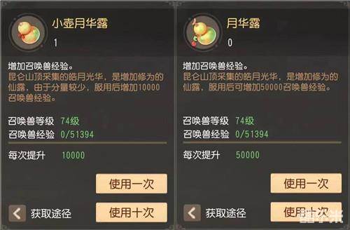 提升等级:召唤兽具有“经验”及“等级”两个基础属性,用于表示召唤兽的成长程度。少侠完成任务或相对应的活动时,只要系统给予召唤兽奖励,无论跟随你出战的召唤兽为存活、鬼魂或倒地状态,都能获得相应的经验。需要注意的是,当召唤兽的级别到达了上限,将无法再增加经验。召唤兽等级最多只能升至少侠等级+5级;通过使用月华露等道具,最多只能将召唤兽升至少侠等级+10级。