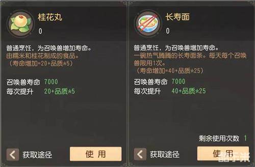 延长寿命:少侠可以给召唤兽喂食宠物口粮、桂花丸或长寿面,增加其寿命。桂花丸与长寿面的品质越高,增加的寿命越多,所以购买时买品质上乘为佳(宠物口粮与桂花丸都无使用次数的限制,而长寿面每日只可投喂一次)。当达到召唤兽寿命上限后,喂食任何食物都无法继续增加其寿命。