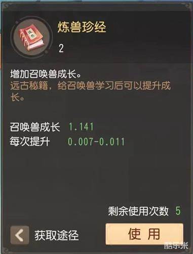 提高成长:召唤兽的成长值,能给其带来一定的属性加成,当其成长值过低,少侠可给召唤兽学习炼兽珍经,随机提升一定范围内的成长值,最高不超过该兽成长值上限。召唤兽成长距离最高成长越多,使用炼兽珍经提升幅度越大。每只召唤兽只能使用5次炼兽珍经,炼妖、洗炼或其他方式使召唤兽重新生成后,该数值重置。