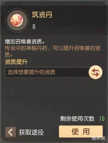 提升资质:召唤兽的资质决定了宠物的法术、攻击力、体力等素质的高低。提升符合召唤兽定位的资质,能放大其优势。给召唤兽喂食筑资丹,可以指定提升召唤兽的某一项资质,提升数值随机,最高不超过该兽资质上限。每只召唤兽一生只可以吃10次筑资丹,炼妖、洗炼或其他方式重新生成后,该数值重置。(需要注意的是,野生召唤兽、绑定召唤兽、泡泡、小悟空、神兽不允许使用炼兽珍经和资质丹)。