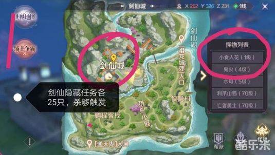 任务说明:剑仙城内找到可爱的小食人花(1)和鬼火(4),每种怪击杀25只,就可以获得隐藏任务奖励了。
