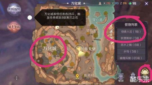 任务说明:万化城内找到可爱的幼食人花(1)和软猬刺球(4),每种怪击杀25只,就可以获得隐藏任务奖励了。
