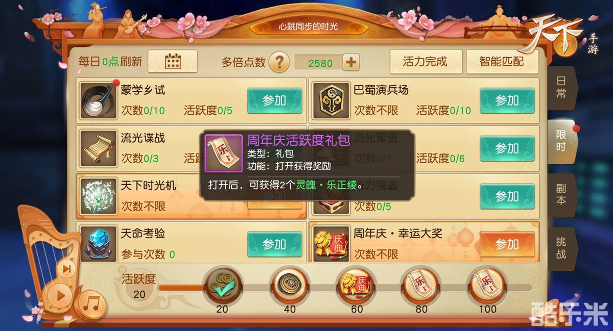 同时少侠通过完成日常任务达到固定活跃度,就能获得一定数量的“灵魄·乐正绫”,集齐30个灵魄就能合成获得伙伴·乐正绫啦!