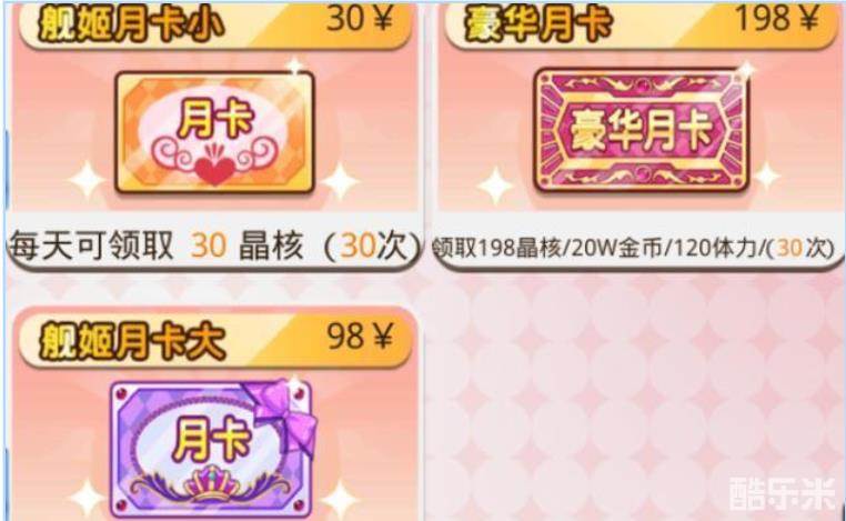 舰姬大月卡:玩家需要充值98元人民币即可获得。对应的特权福利为:每天可领取98晶核,持续30天时间。