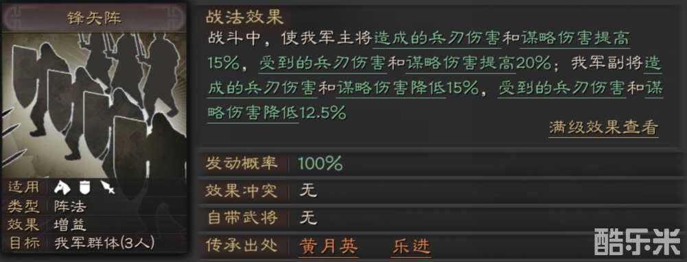 锋矢阵:使我军主将造成的伤害提升,受到的伤害提升。使我军副将造成的伤害降低,受到的伤害降低。(辅助友军)