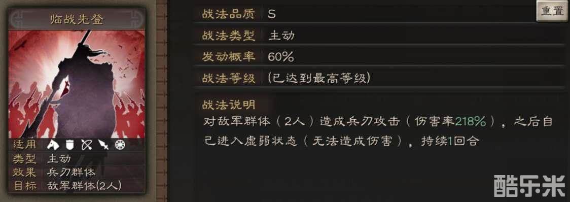 【主动战法】临战先登:对敌军2人造成兵刃伤害,之后自己进入虚弱状态持续1回合。