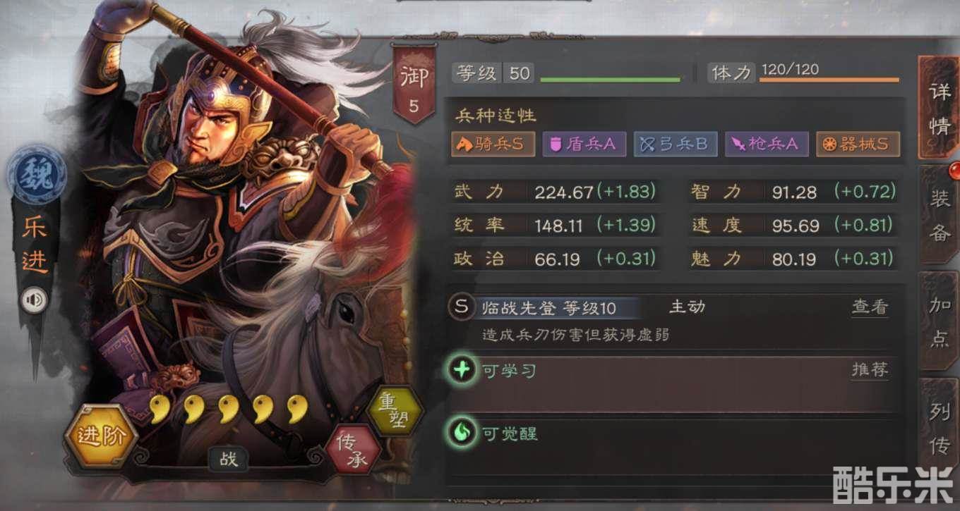 在《三国志·战略版》中,乐进是一位辅助型输出武将。在属性成长上,乐进拥有不错的武力、统率属性成长,战斗时可以打出高额的群体伤害。在兵种上乐进有两种S级和两种A级兵种适性,兵种的搭配颇为丰富。