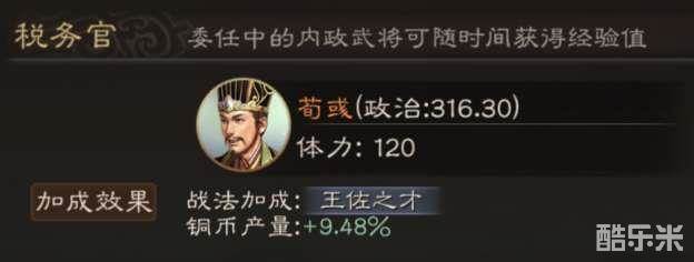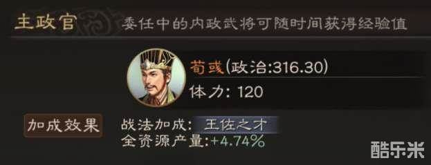 委任主政官可以大幅提升所有种类的资源和铜币产量,加成效果受到政治属性影响,而荀彧拥有全游戏最高的政治属性,推荐优先选择主政官,因为主政官是所有任职里总资源加成收益最高的一个职位。