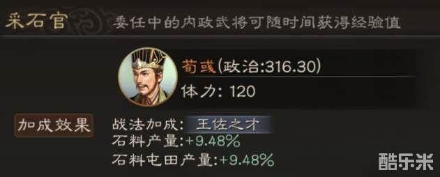 委任采石官可以大幅提升石料产量和石料屯田产量加成,石料也是城建里最缺的一种资源,荀彧政治最高,可以选择委任为采石官来提升稀缺资源的产量。