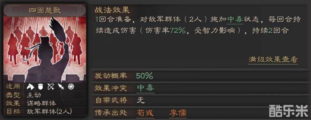 可拆战法【主动战法】四面楚歌:1回合准备,对敌军2人施加中毒状态持续2回合。