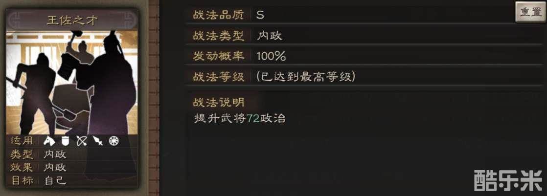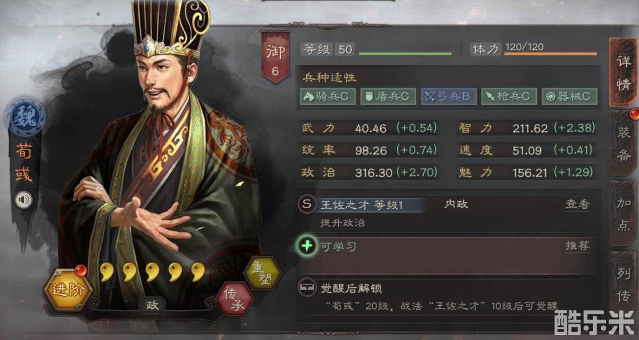 分析:荀彧的自带战法可以为荀彧提供大量的政治加成,使得荀彧拥有游戏中最高的政治属性。当荀彧委任为主政官、税务官时能给主公带来高额的资源、铜币收益加成。