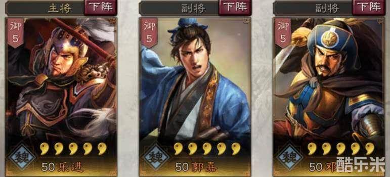 1. 前期组合:乐进+郭嘉+邓艾(统御15)