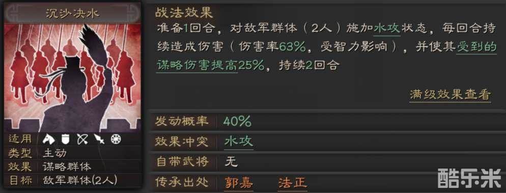 可拆战法【主动战法】沉沙决水:1回合准备,对敌军2人施加水攻状态,并使其受到的谋略伤害提升持续2回合。