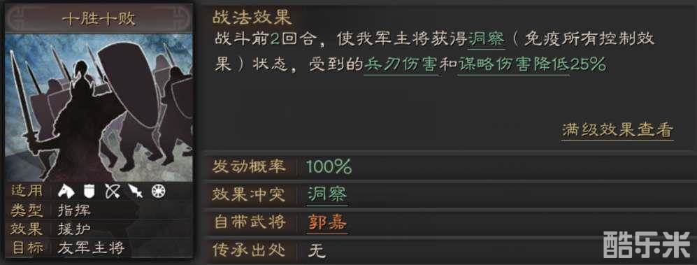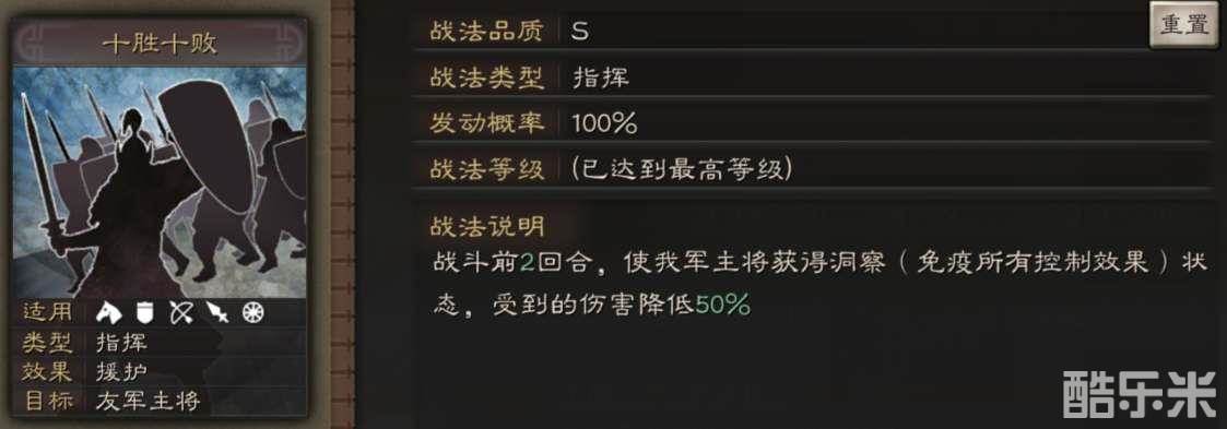 【指挥战法】十胜十败:战斗前2回合,使我军主将获得洞察状态,并且降低受到的伤害。