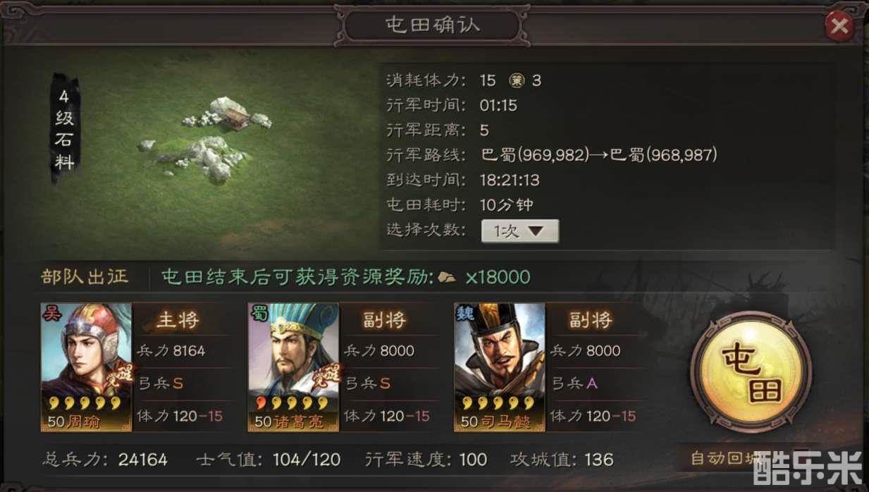在已占领领地上还可以进行“屯田”操作,屯田需要10分钟时间,可以获得大量当前领地产出的资源,领地等级越高屯田获得资源也就越多。每次屯田会消耗3个策书,主公需要留意策书的使用情况噢!