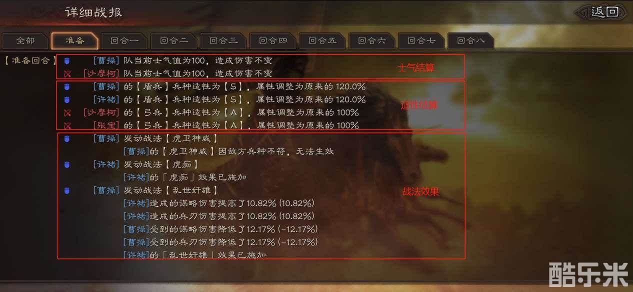 在战斗回合中部队首先会结算部队的当前士气值,当士气值低于100的时候,造成伤害会有所下降,如果士气为0,那么造成伤害会降低70%。在结算完士气后会统计武将的兵种适性和兵种判定,C/B/A/S适性分别会调整士兵属性为原来的70%/85%/100%/120%。然后会开始根据主公的城建给武将一定的加成。最后指挥战法、被动战法、兵种战法、阵法战法也会在准备回合中生效。