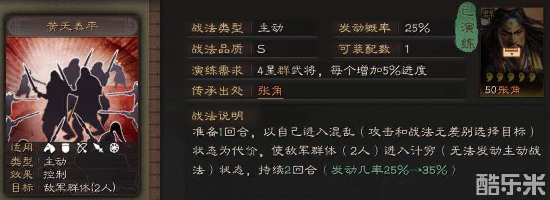 【黄天泰平】可从武将张角传承获得,战法可以造成强力的群控效果,并且效果持续2回合,在战中表现非常优秀。不过战法也会让自己陷入混乱状态,所以配备给有洞察状态的武将或者配备给以自身为主的辅助武将比较适合。否则混乱也会对我方团队造成一定的损失(比如辅助会把增益加到敌军身上这种情况)。战法拥有25%-35%的发动几率,虽然发动几率较低,不过战法的表现还是非常强力的。战法没有任何兵种限制,可以随意配合使用。