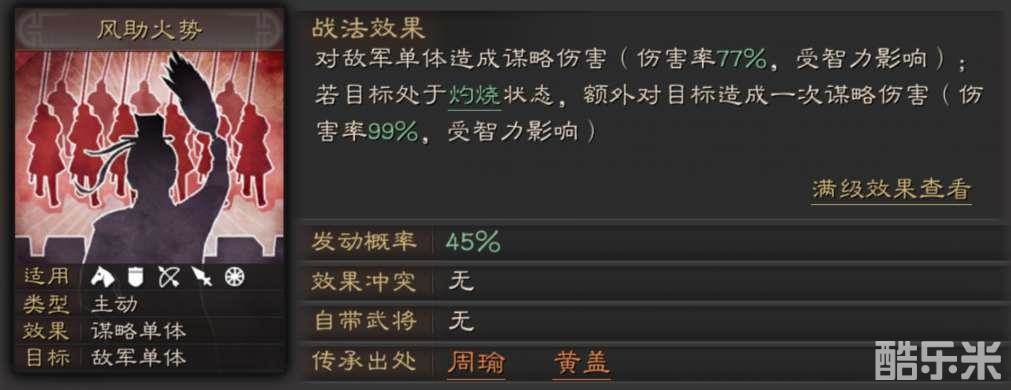 可拆战法【主动战法】风助火势:对敌军单体造成谋略伤害;若目标处于灼烧状态,额外对目标造成一次谋略伤害。