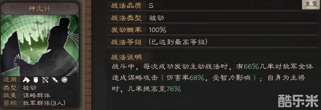 【被动战法】神火计:战斗中,每次成功发动主动战法时,有一定几率对敌军全体造成谋略伤害;自身为主将时,几率提高。
