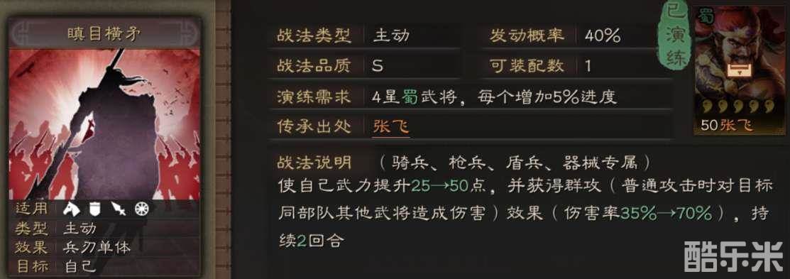【瞋目横矛】可从武将张飞传承获得,战法可以为自己增加大量的武力属性,并且获得群攻效果,每一次普通攻击都能变成一次全体攻击,但是如果可以搭配连击便能激发出双倍的群攻效果。战法拥有40%的发动几率不算低,不过要注意除了弓兵兵种无法使用,其他兵种都可以随意配合使用。