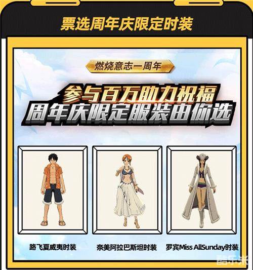 参与百万助力祝福 《航海王燃烧意志》周年庆限定时装由你选!
