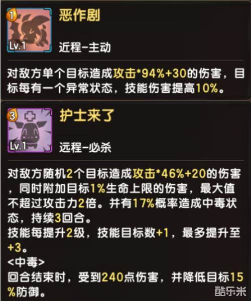 在凯比的四个技能中,两个主动技能都是用来输出的。【恶作剧】攻击单体目标,并且伤害还会因为目标的减益状态增加;【护士来了】作为凯比的必杀技能,伤害更是提升了一个档次,技能满级之后能造成全体AOE,还能造成中毒状态,不过最重要的是造成目标生命上限百分比的伤害,所以凯比越到后期输出越高。