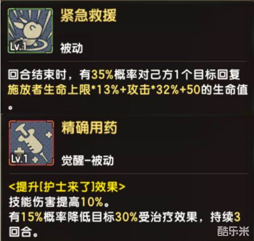 而剩下两个被动技能则会展现凯比除了输出之外的另一面。【紧急救援】是凯比的招牌技能,每回合结束都有几率回复队伍中血量最低的宠物的生命值;而觉醒之后的被动【精确用药】能让凯比的治疗效果得到加强,在攻击的时候还能降低目标的治疗效果,满级之后能降低75%,相当给力。