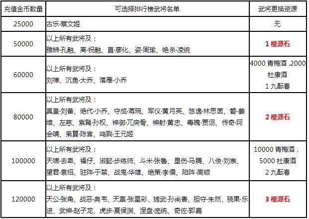 1、活动期间,累计充值金币数量达到对应金额,可以联系在线客服申请1个排行榜武将奖励,或对应金额的进阶酒或橙源石奖励;