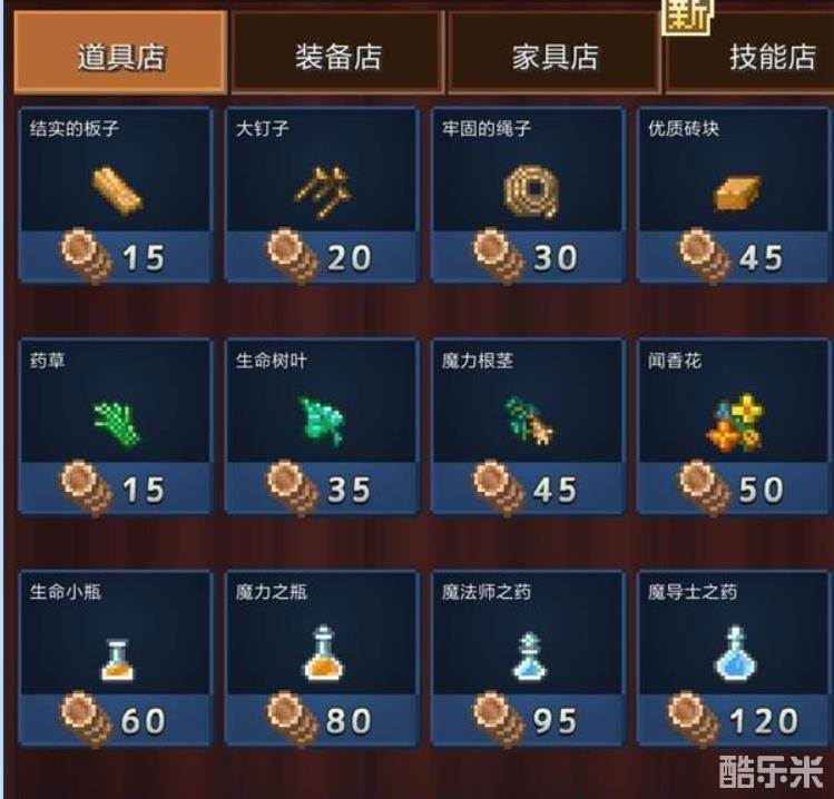 道具店:由商人建造,消耗野草制造并贩卖道具给客人获得铜币