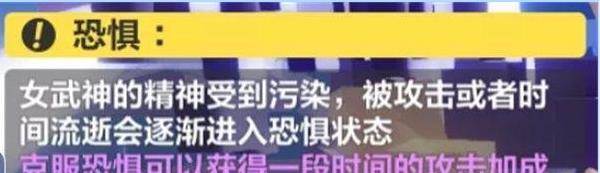 恐惧是这次新出现的buff,随着时间流逝或者受到攻击,都会减少恐惧效果的cd。陷入恐惧效果无法攻击移动,同时以女武神为中心产生一个恐惧结界,敌人会陷入时空减速一样的状态,并且将敌人排挤出结界,无法进入。需要注意的是,陷入恐惧状态时,敌人离女武神太近的话,还是能攻击到女武神的,随后才会被挤出结界。