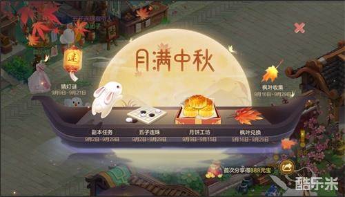 惊喜不止如此!至此中秋佳节之际,“月满中秋”福利活动全面开放。即日起至9月29日,玩家参与中秋主题特色活动,就有机会赢得莹樱月兔(坐骑)、五行幻魂(新道具)、玉枝月握(武器时装)、龙脉自选宝箱、水晶自选宝箱等大奖,更有888元宝福利来玩就送,人人有份!