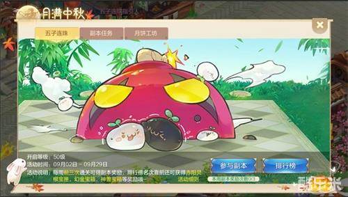 “猜灯谜”活动将于9月9日至9月21日限时上线,玩家每天可猜6次灯迷,不仅可以获得经验和银币外,还有几率获得莹樱月兔、五行幻魂、白月灵根宝匣等奖励;当天猜对4次灯谜,玩家还可以额外获得“灯谜大礼包”1份。“五子连珠”副本任务从即日起至9月29日限时开放,玩家只需进入副本即可自动战斗,高额经验、各种宝石、幻金宝箱,神兽宝箱等福利唾手可得。