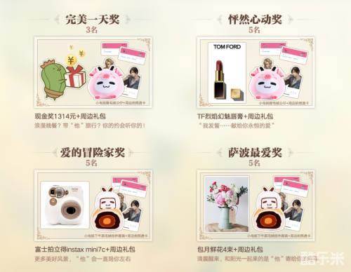 本次活动设立五个奖项,完美一天奖、怦然心动奖、爱的冒险家奖、萨波最爱奖。萌萌的奖项名字背后,是超级令人心动的奖励哦!1314现金,TF口红,拍立得,包月鲜花,哪个是你最喜欢的奖品呢~