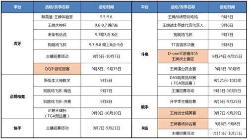 9月初至今,斗鱼“斗鱼D-one手游嘉年华”、触手“王牌战士精英赛”、B站“王牌赛场排名赛”等6大直播平台赛相继开赛。