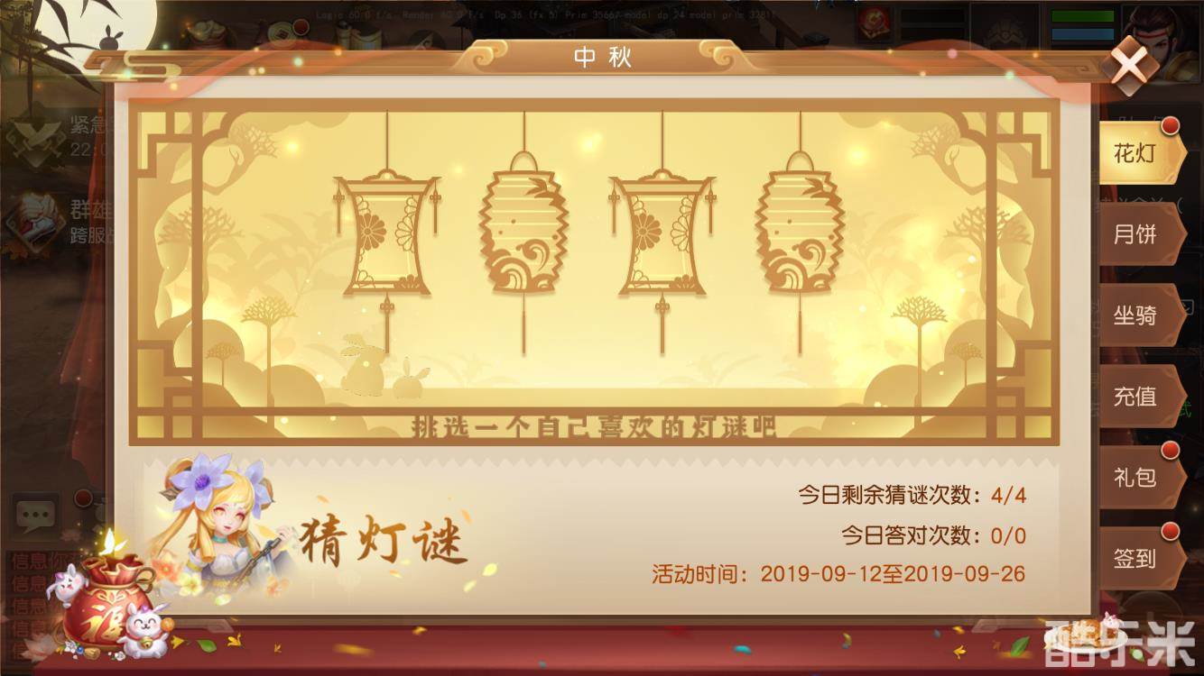 赏花灯,是中秋佳节的保留节目。在活动期间,等级≥30级的主公也可以在《三国如龙传》之中每天猜四次灯谜,赢取天灯和花灯,收获满满祝福。