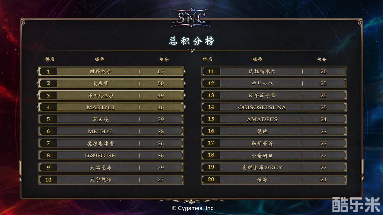 此外,本次SNC积分赛也至关重要,经过6-9月的长期激烈对抗与选拔, “绀野纯子”、“爱衣酱”、“茶叶QAQ”与“Makiyui”四名选手最终凭借自身强劲的实力,获得了晋级海选终轮的最后四个名额。他们将在下周六与其他晋级选手展开巅峰对决,争夺晋级总决赛的八个宝贵名额,更多巅峰对决请不要错过!