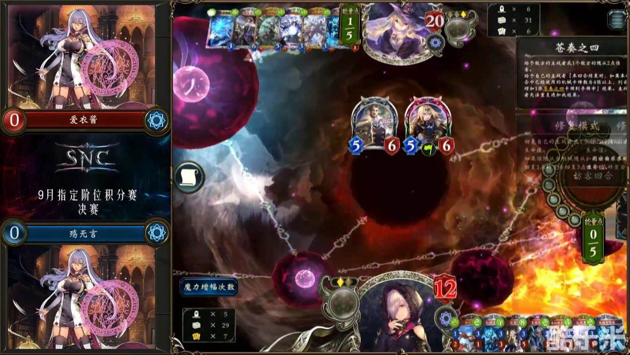 爱衣酱在5费准时打出“机学魔导书士”并回手“苍奏之四”,进一步扩大自己的优势,将殇无言压至12血。殇无言虽在之后的回合全力解场,却也无力回天。最终爱衣酱手持两张“真实的狂信者”,在第八回合成功将对手斩杀!