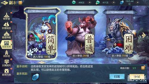 龙宫宝库副本是获得灵石的首选方式,每天可挑战3次,挑战的难度等级越高,奖励越多。具体来说,就是玩家进入龙宫宝库消灭4波盗宝贼,即可获得大量灵石奖励,如果能击败盗宝贼首领,还可获得额外的灵石奖励。