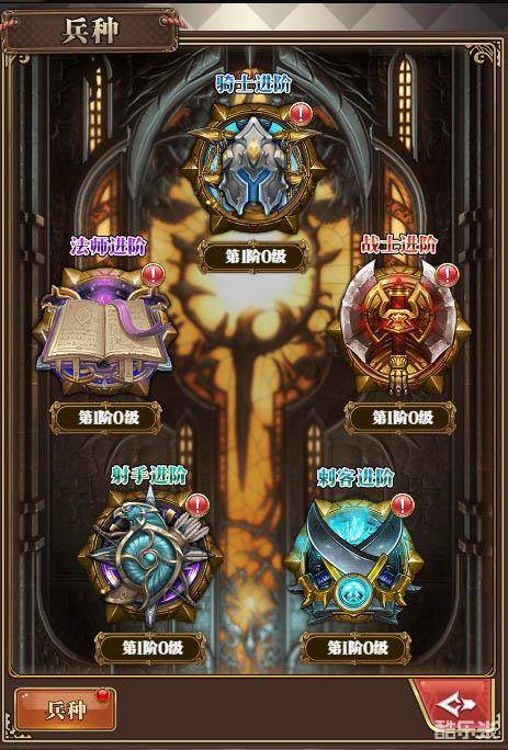 在开服第二天,并且玩家等级达到80级以后即可进入兵种系统。兵种共分为5种,分别为战士、骑士、法师、弓手、刺客,每个兵种可为对应兵种类型的帝王加成属性,如提升骑士后,所有骑士帝王均可享受属性加成效果。