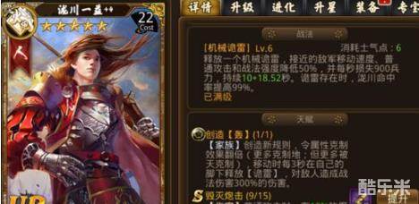 战法:诡雷 6士气,CD15s,自身前方直径30m释放,接近敌军移速&双攻降低50%每秒损失900兵力,持续30s,debuff S 真伤A 技能评价四星。