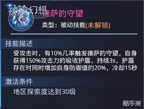 比如被动技能“德萨的守望”:受攻击时,有10%几率触发德萨的守望,自身获得150%攻击力的吸收护盾,持续3s,护盾存在时同时增加自身防御值的20%!非常强力的被动技能,是打BOSS和PK必备的神技!还有更多丰厚奖励等你来探寻!