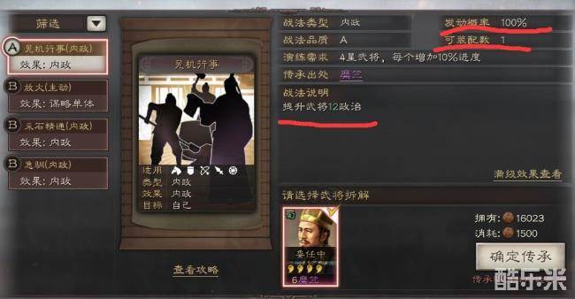 在传承界面还可以查看每个武将技能的说明及技能的发动率,能更详细地了解每个武将的用法。