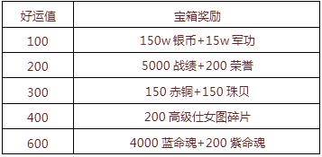 【活动内容】活动期间,每消费1000金币,即可获得100好运值,累计获得好运值可开启奖励宝箱。